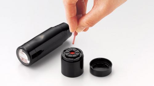 本体から印面キャップ、補充口栓の順に外し、インキを補充口へ数回に分けて1本分を目安に滴下してください。完全に浸透してから本体にセットし可動式パッドを数回押してご使用ください。